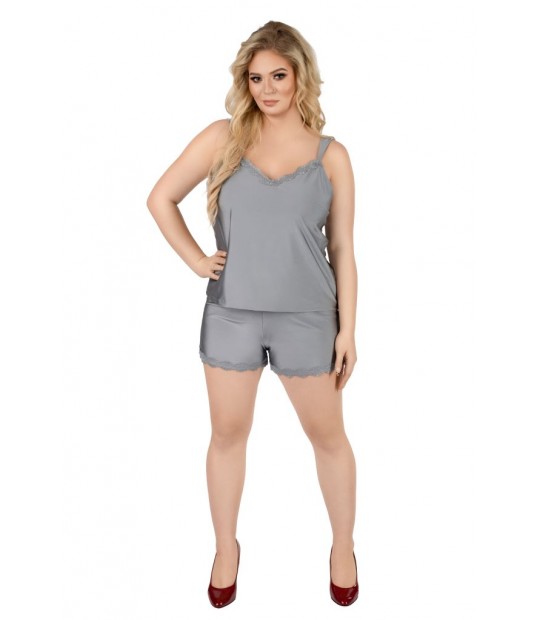A very sensual set of underwear in a beautiful gray color, consisting of shorts and a delicate chemise. The set is made of shiny, elastic fabric, decorated with a beautiful, delicate steel lace that adds lightness and sensuality to the whole. The chemise has wide straps that make wearing it a pure pleasure.Chemise length: in sizes 38/40-46/48 approx. 80 cm, in sizes 50/52-54/56 approx. 90 cmshorts length: approx. 35 cm
