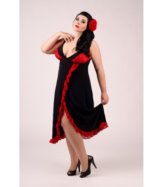 Długa koszulka nocna wykonana z elastycznej dzianiny w ognistej czerwieni i głębokiej czerni. Niezwykle kobiecy krój nawiązuje do eleganckich sukienek. Koronkowy biust, głęboki dekolt i skrzyżowane na plecach ramiączka przyciągną uwagę każdego, doskonale dopasowując się do sylwetki Size Plus. Dół koszulki wykończony modnymi w tym sezonie falbankami sprawia, że całość prezentuje się niezwykle zmysłowo i ponętnie.