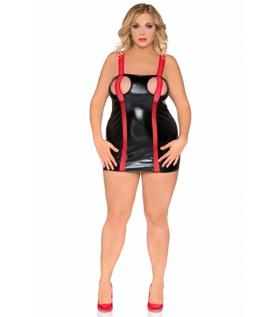 Seksowna czarna, przylegająca do ciała koszulka pięknie eksponuje krągłości. Czerwona kabaretka dodaje drapieżnego charakteku, jednocześnie pełniąc rolę szerokich ramiączek podtrzymujących duży biust. Wycięcia na piersiach zostały delikatnie zakryte kabaretką. Pionowe paski wyszczuplają sylwetkę, a trójkątna dekoracja na pośladkach przykłuwa uwagę.